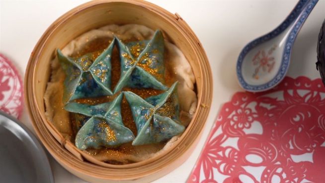 Blaue Teigtaschen zum chinesischen Neujahrsfest